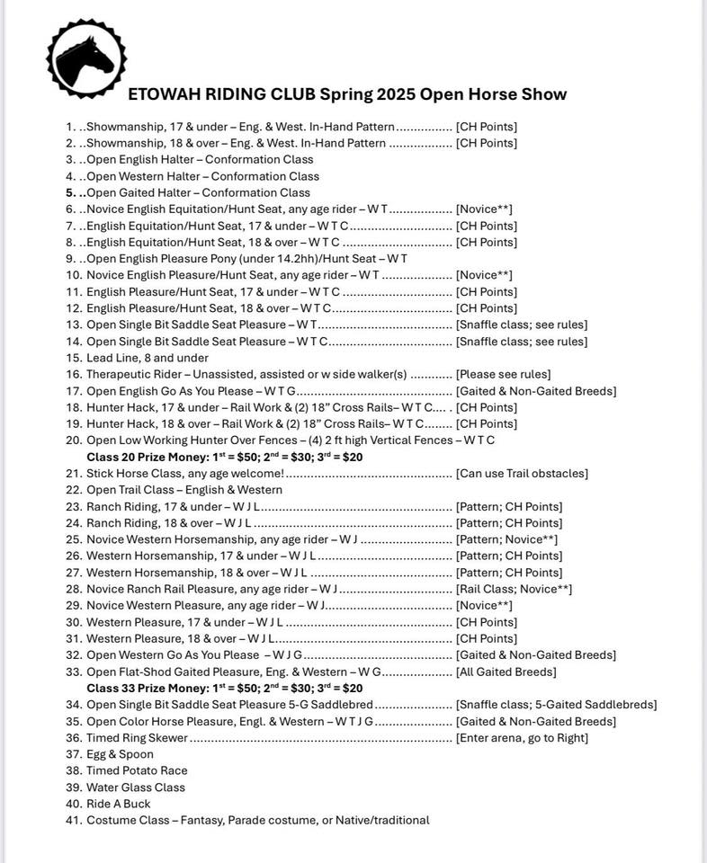 Rider Info: Class list subject to change until the month of show, please use program as an example of classes offered. Properly fitted helmets are REQUIRED by any rider under 18 in english AND western tack. New 2025 rules & class order on program. No refunds given for classes scratched on the day of the show. Changes must be made at least 3 classes ahead.